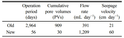 칼럼 충진 후, 공극 부피(pore volume; PV) 계산을 위해 증류수로 포화시켜 주었다. 각 칼럼의 공극 부피는 포화 상태 칼럼과 건조 상태 칼럼의 질량 차이로 결정하였으며, Old 칼럼의 1 PV는 750 mL, New 칼럼의 1 PV는 795.3 mL로 계산되었다. 두 칼럼의 프로파일 샘플링 당시의 칼럼 운영 기간(days), 누적 공극 부피(PVs), 유속(mL day-1), 침투속도(cm day-1)는 Table 2에 제시하였다.