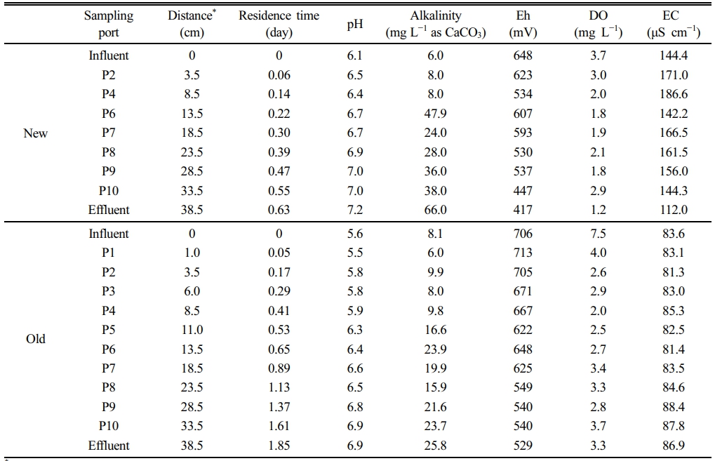 이때 V는 유입구부터 특정 샘플링 포트까지의 칼럼 부피(cm3), n은 공극률(porosity, -), Q는 유량(mL day-1)을 의미한다. 각 칼럼의 공극률을 고려하여 실제로 물이 흐를 수 있는 부피를 유량으로 나누어서 체류시간을 산정하였다. Old 칼럼의 총 체류시간은 1.85일, New 칼럼은 0.63일로 계산되었다. 프로파일 샘플링 과정에서 시료를 채취한 포트의 거리와 체류시간, 측정한 수질 항목(pH, 알칼리도, Eh, DO 및 EC) 결과는 Table 3에 제시하였다.