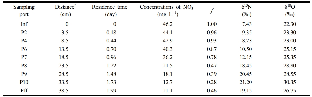 프로파일 샘플링이란 칼럼의 유입구에서 유출구까지의 시공간적 변화를 파악하기 위한 방법으로, 칼럼 측면에 설치된 각 포트를 통한 시료 채취를 말한다. 본 연구에서는 칼럼 체류시간에 따라 각 포트에서 칼럼 내 질산염 제거 및 반응 속도 비교를 위한 시료(Old 및 New 칼럼, 포트당 60 mL)와 질산염 변환 과정에 따른 질산염 및 물 안정 동위원소 변화 분석을 위한 시료(New 칼럼, 포트당 100 mL)를 구분하여 채취하였으며, 칼럼 내 반응 프로파일을 분석하였다.