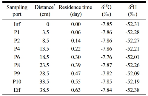 두 칼럼에서의 유속이 차이가 나므로 각 포트에서 측정한 수질 항목들은 모두 체류시간(residence time)에 대한 값으로 제시하였다. 체류시간이란 칼럼에 공급된 유입수가 칼럼 내부에서 머무르는 시간을 의미하며, 식 (6)을 통해 계산한다.