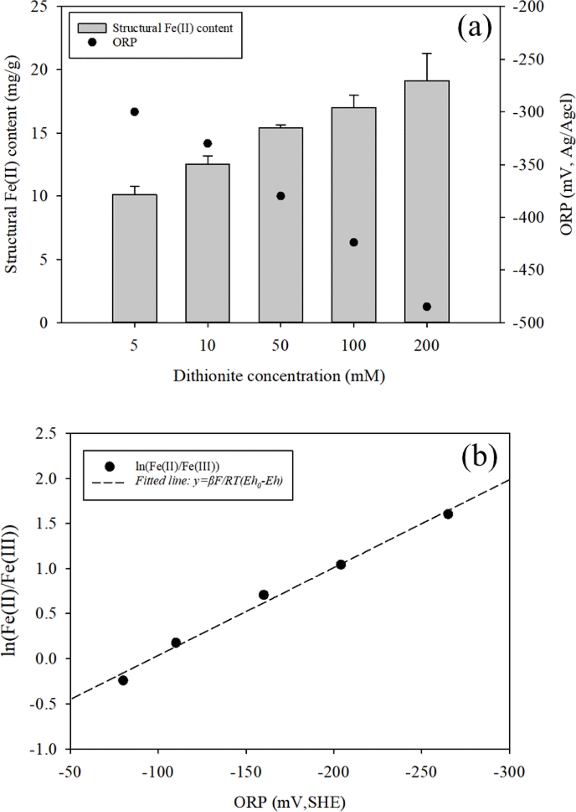 Fig. 1 (a) Structural Fe(II) content of montmorillonite with increasing dithionite concentration, (b) Linear relationship between Fe(II)/Fe(III) ratio and redox potential. |