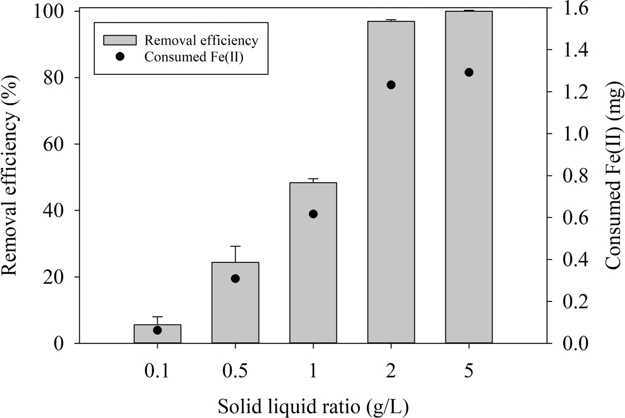Fig. 3 Cr(VI) removal capacity and Fe(II) consumption by solid to liquid ratio. |