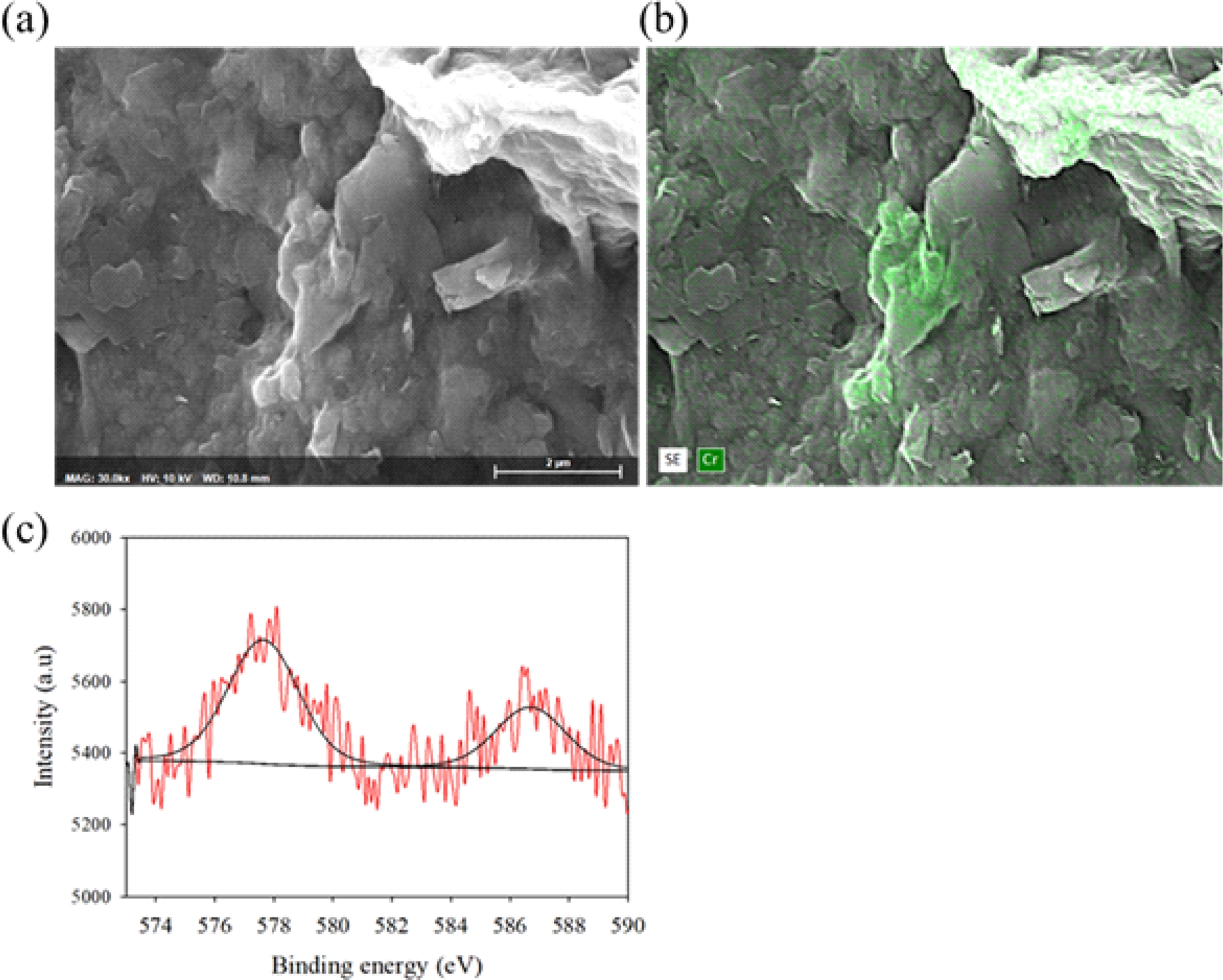 Fig. 4 Characterization of Cr reduction products associated with montmorillonite; (a) SEM image of montmorillonite surface, (b) EDS mapping showing Cr precipitates on the clay surface, (c) XPS spectra of Cr 2p confirming the presence of Cr(III). |