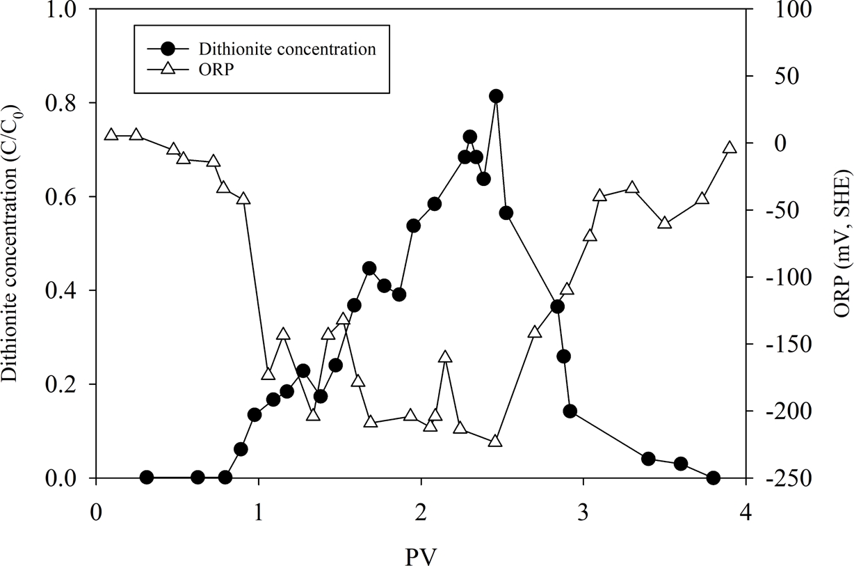 Fig. 5는 50 mM dithionite를 2 PV 동안 pulse로 주입했을 때의 농도와 ORP 변화를 보여준다. 주입된 dithionite는 컬럼 내부를 따라 이동하면서 점차 소모되었고, ORP는 약 -200 mV(SHE)까지 낮아졌다. 형성된 환원 조건은 약 3 PV 동안 유지되었으며, 배치 실험에서 확인된 환원 거동이 유동 조건에서도 재현될 수 있음을 확인하였다.