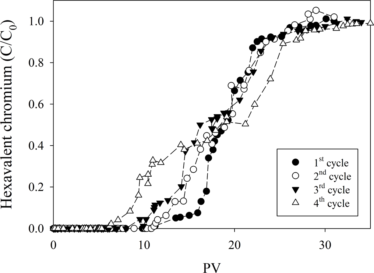 또한, 환원 구역의 재생 가능성을 평가하기 위해 별도의 컬럼에서 dithionite 재주입 실험을 수행하였다. 상기 방법과 동일하게 dithionite pulse 주입과 Cr(VI) 연속 주입을 총 4회 반복하여 환원 구역의 재생성을 평가하였다.
