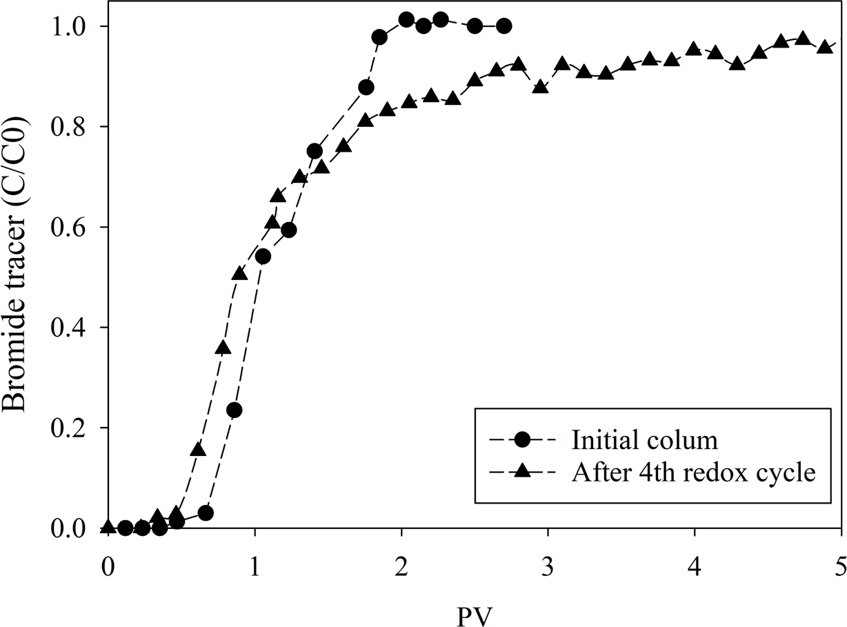 Cr(VI) 제거실험 완료 후 dithionite를 재주입하여 환원 구역의 재생 가능성을 확인하였다. Fig. 8과 같이 dithionite 재주입 시 컬럼 내 Fe(II)가 재형성되며 환원 구역이 복원되고 Cr(VI) 제거 성능이 회복되었다. 4회 재주입을 반복하는 동안 Cr(VI) 파과곡선이 점차 변화하며 사이클이 증가할수록 제거 성능이 다소 감소하는 경향이 나타났으나, 각 사이클에서 여전히 상당한 수준의 Cr(VI) 제거가 유지되었다. 각 사이클별 Fe(II) 용출량과 총 Cr 제거량을 Table 3에 제시하였으며, 재생이 반복될수록 구조철 용출량이 증가하여 Cr(VI)의 제거량 감소가 확인되었다. 또한 1차 및 4차 사이클 종료 후 Br⁻ tracer test(Fig. 9)에서 조기 파과 및 tailing 증가가 관찰되었는데, 이는 점토 입자 응집이나 Cr(III) 침전물로 인한 pore clogging에 의해 우선흐름(preferential flow)가 일부 형성된 것으로 해석된다.