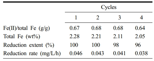 구조철 Fe(II)의 Cr(VI) 제거에 대한 재사용성을 평가하기 위해 산화환원 반복 실험을 수행하였다. 앞선 실험에서 Cr(VI) 제거 반응에 사용한 시료를 회수하여, 40 mL의 50 mM dithionite 로 재처리하여 Fe(II)를 재생시켰다. 이후 잔류 dithionite를 제거하기 위해 질소로 퍼지한 증류수로 3회 세척한 뒤 다시 Cr(VI)와 반응시켰다. 이러한 재생 사이클은 총 4회 반복하였으며, 각 사이클 종료 시 하나의 시료를 회수하여 구조철 Fe(II)와 총 철 함량을 분석하였다.