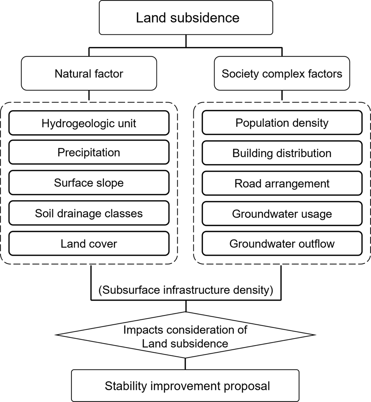 Fig. 1 Conceptual diagram of land subsidence factors and the overall research flow of this study. |