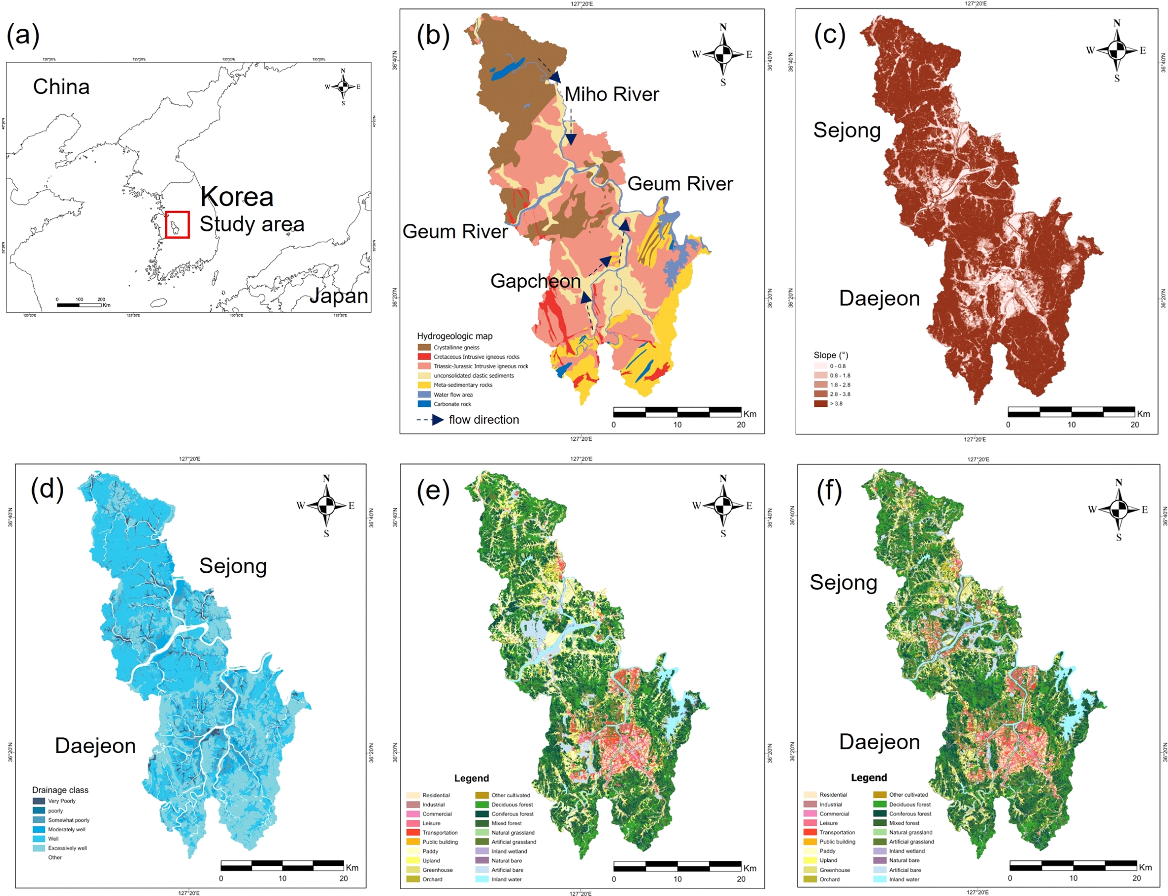 Fig. 2 Location of the study area (a); hydrogeologic unit (b); slope gradient (c); soil drainage classes (d); land cover classification in 2013 (e); and land cover classification in 2023 (f). |