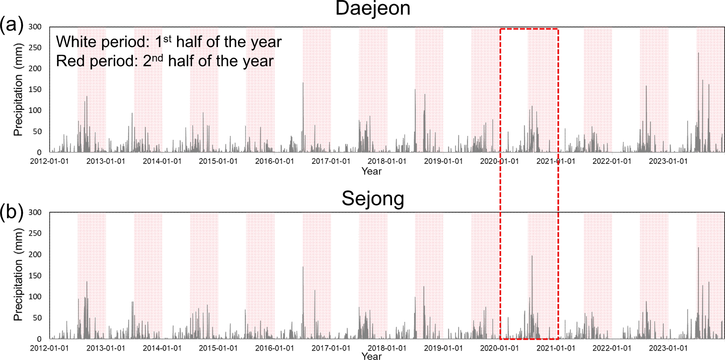 Fig. 3 Annual precipitation in Daejeon and Sejong from 2012 to 2023. Red boxe exhibits the highest precipitation and the longest duration of rainfall during the study period. |
