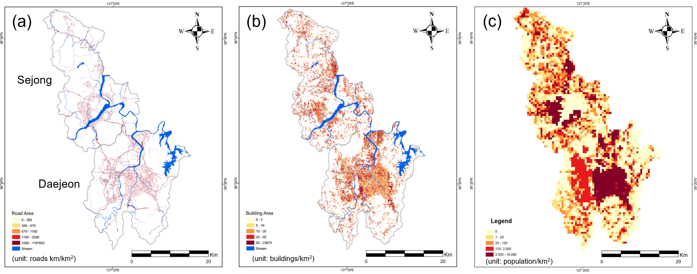 Fig. 4 Spatial distribution of (a) roads, (b) buildings, and (c) population density in Daejeon and Sejong for 2024. |