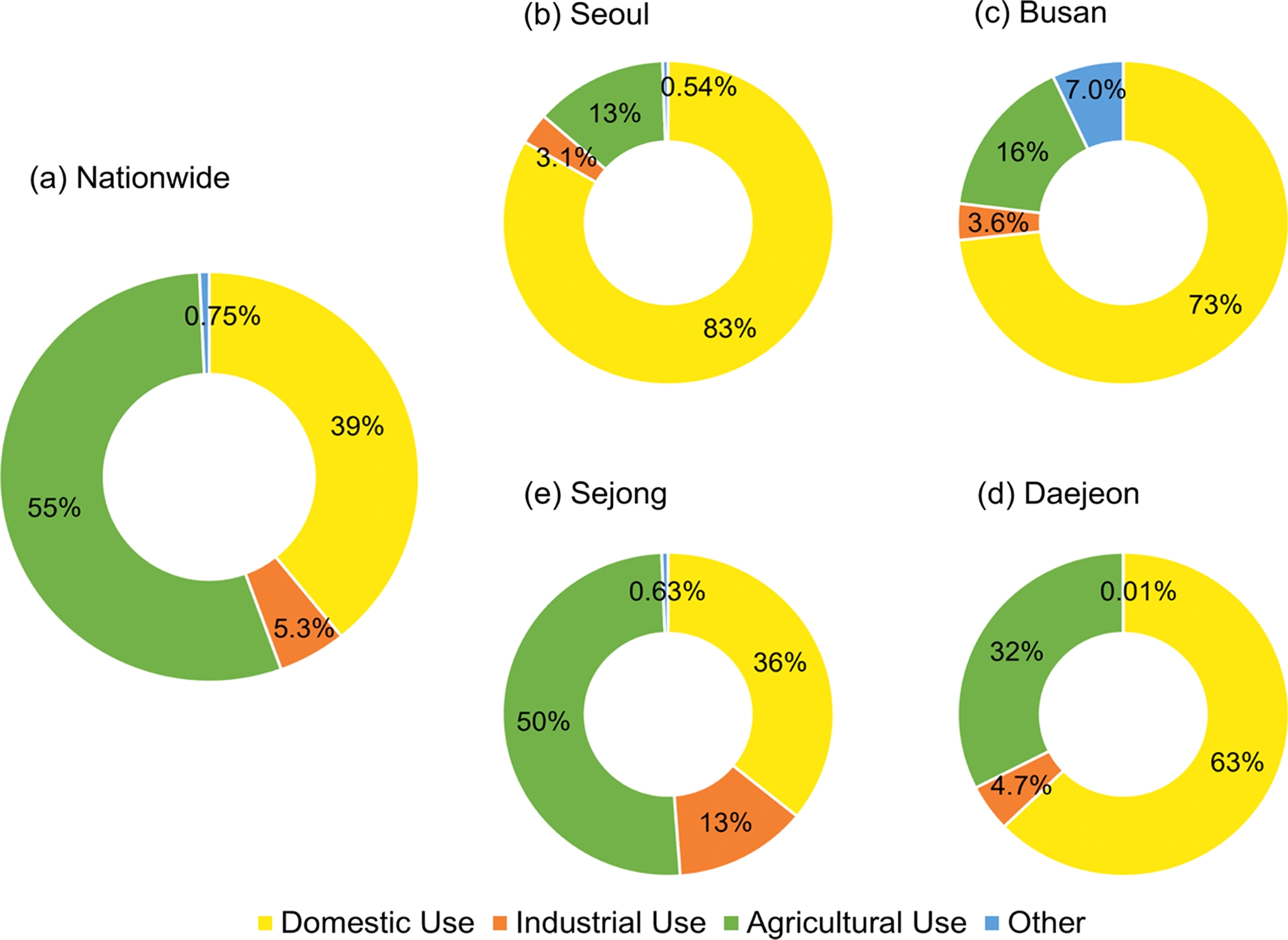 대도시의 지하수 이용 양상과 달리, 세종시의 지하수는 농업용수 50%, 생활용수 36%로 전국의 지하수 활용 용도 평균치와 유사한 분포를 보인다(Fig. 5d). 이는 앞서 Fig. 2에서 논의한 바와 같이, 세종시는 현재 도시개발이 지속적으로 진행되는 한편, 전답과 과수원 등에서는 여전히 활발한 농업 활동이 이루어지고 있어 농업용수의 사용량이 높은 것이 반영된 것으로 판단된다. 또한, 다른 지역들에 비해 공업용수로 사용되는 지하수량이 상당히 많은 것이 보인다. 대전시는 농업용수 비율이 32%로 서울시와 부산시에 비해 높게 나타나지만, 생활용수 63%, 공업용수 4.7%로 대도시형 지하수 이용 형태를 보인다(Fig. 5e). 이는 대전시가 세종시에 비해 인구가 많고 농지가 상대적으로 적은 도시 환경을 가지고 있어 생활용수 중심의 지하수 이용이 이루어지는 것으로 해석된다.