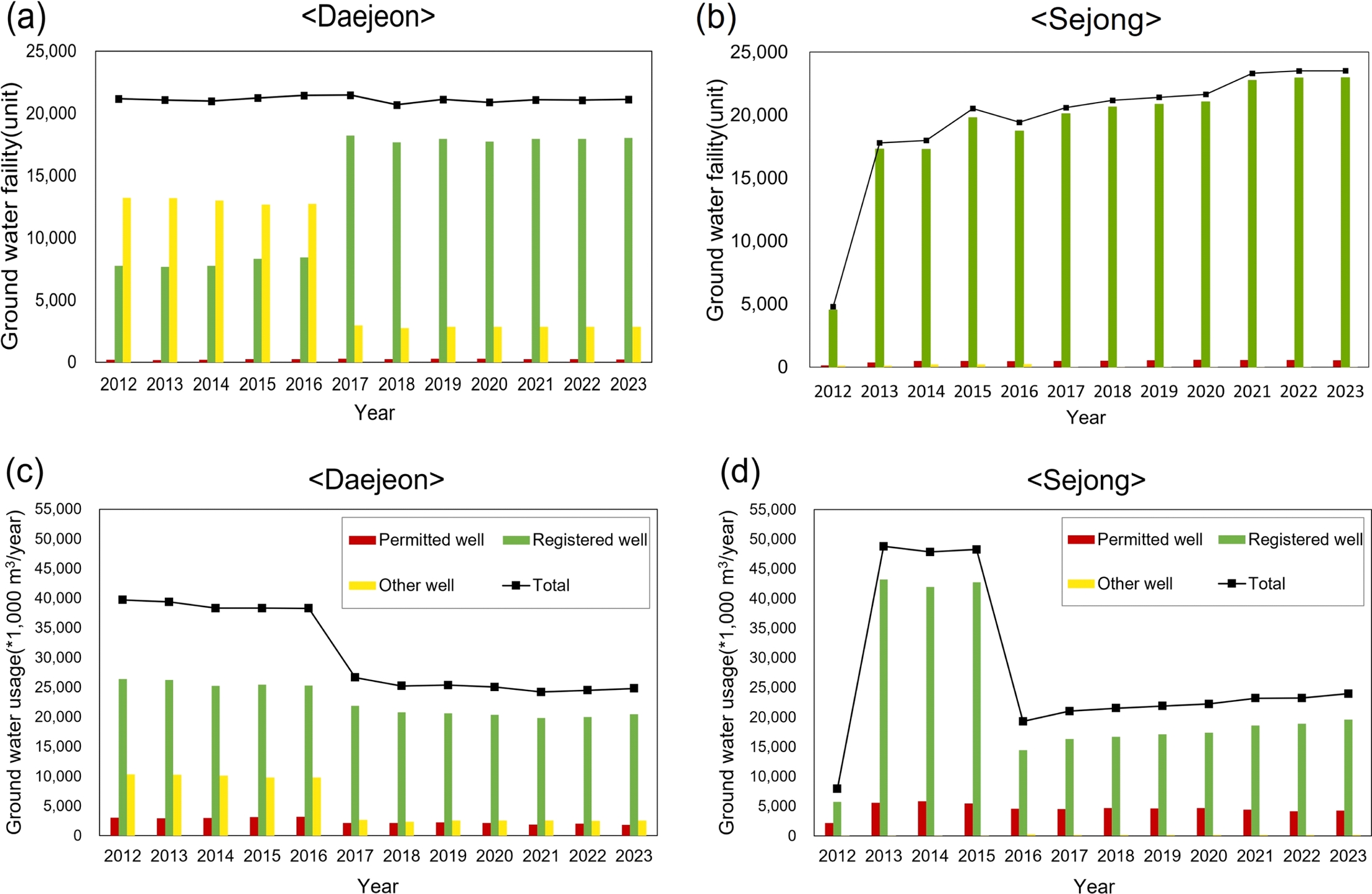 Fig. 6 Number of groundwater facilities in Daejeon (a), number of groundwater facilities in Sejong (b), groundwater usage by facility type in Daejeon (c), and groundwater usage by facility type in Sejong (d). |