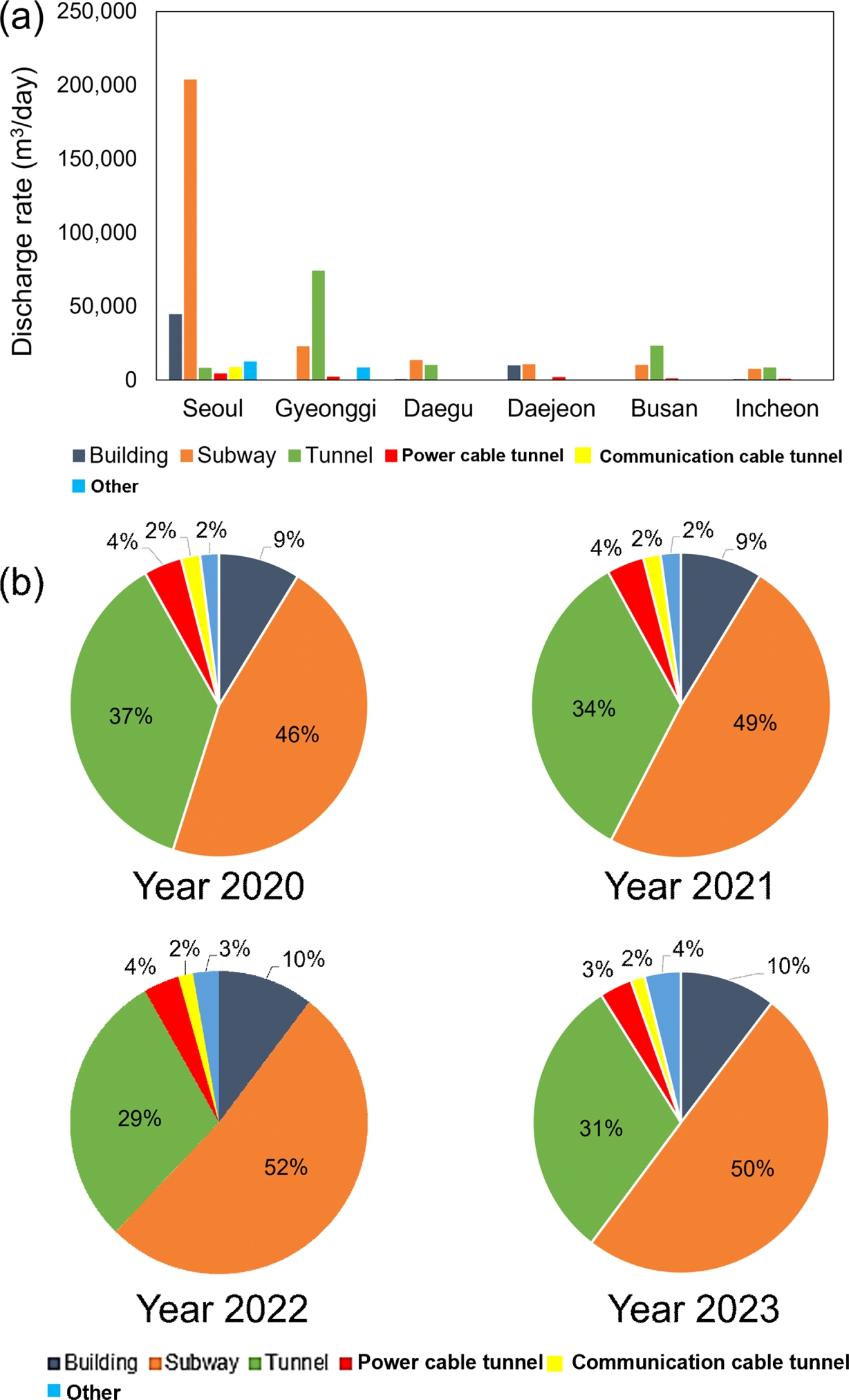 Fig. 7 Status of groundwater outflow occurrences by facility type per city in 2023 (a), and annual groundwater outflow occurrences by facility type from 2020 to 2023 (b). |