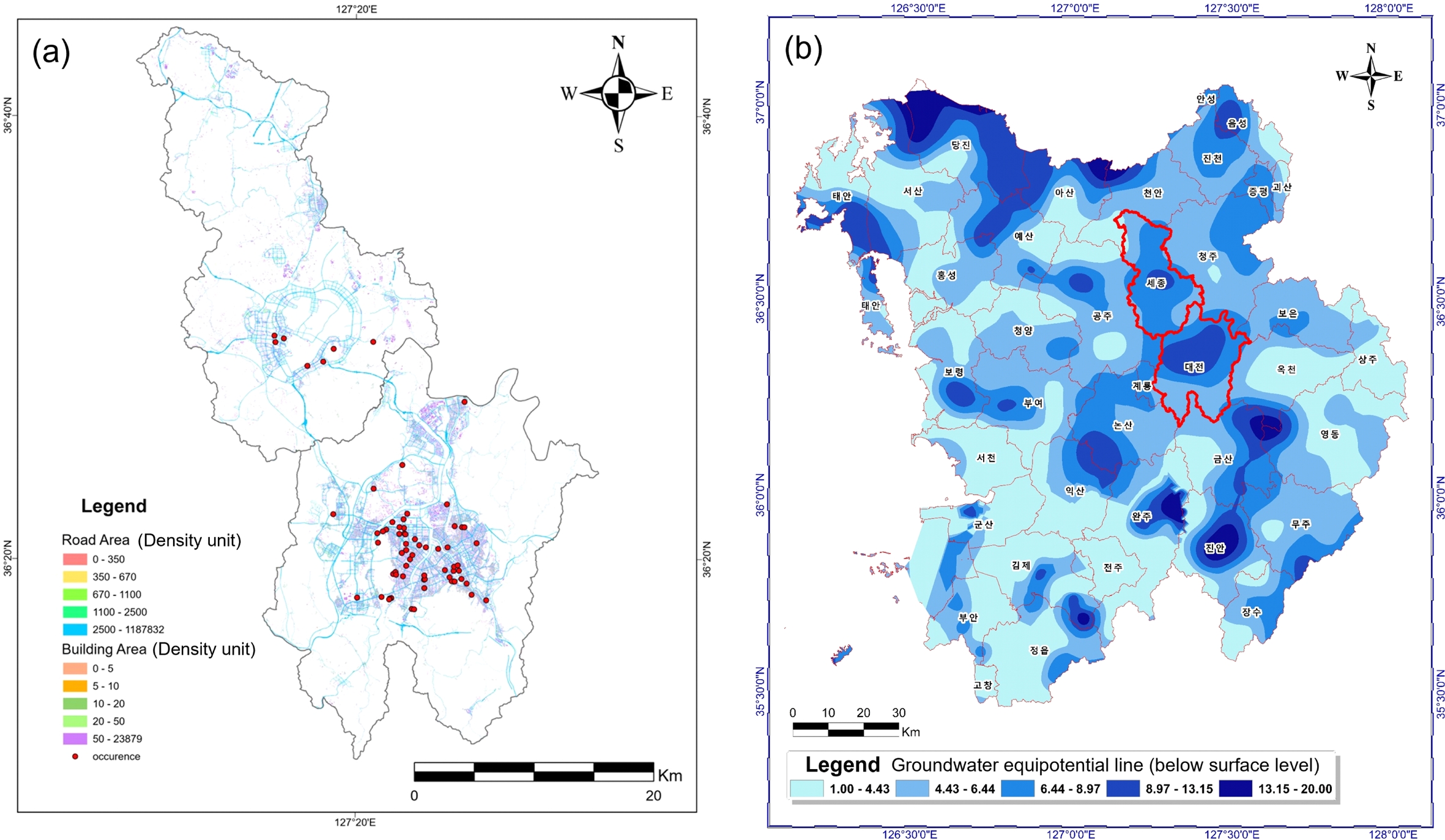 Fig. 8 Spatial distribution of roads, buildings, and reported land subsidence locations (a), and a contour map of groundwater levels in the Geum River Basin showing the study area in red (modified from Kim et al., 2021). Density units represent roads (km) and buildings (number) per square kilometer, respectively |