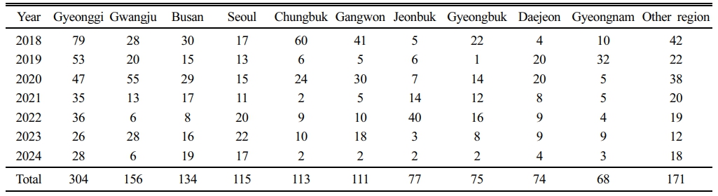 대전시와 세종시의 장기적 도시개발 과정 동안 지반 안정성 유지 방향을 제시하기 위해, 이 연구에서는 지반침하 발생 시기와 원인을 분석하였다. 이를 위해 국토교통부 지하안전정보시스템으로부터 2018년 1월부터 2024년까지의 지반침하 보고 건수를 수집하여 주요 시·군을 중심으로 Table 1에 제시하였다(JIS, 2025). 2018년 이전 자료는 지하안전법 시행 이전으로, 지반침하 신고가 통합 관리되지 않아 신뢰성과 정확한 발생 건수의 파악이 어려워 본 연구에서는 제외하였다. 연구 조사가 이루어진 2018년부터 2024년 사이 지역별로 발생한 지반침하 건수는 경기도가 22%로 가장 많았으며, 다음으로 광주시 11%, 부산시 9.6%, 서울시, 충청북도, 강원도의 순서로 약 8%씩 발생한 것으로 보고되었다(Table 1). 경기도는 서울시와의 접근성이 좋고 주택공급 및 인프라 건설사업이 활발한 지역으로, 국내에서 가장 많은 인구가 거주하고 있으며, 건설공사와 관련된 침하건수가 꾸준히 보고되고 있다. 그러나 연구기간 동안 세종시의 지반침하는 거의 보고되지 않았으며, 발생 원인도 수도관 손상 및 지하시설물과 관련되어 두루 나타나 특정 유발인자를 구별하기는 어려웠다.
