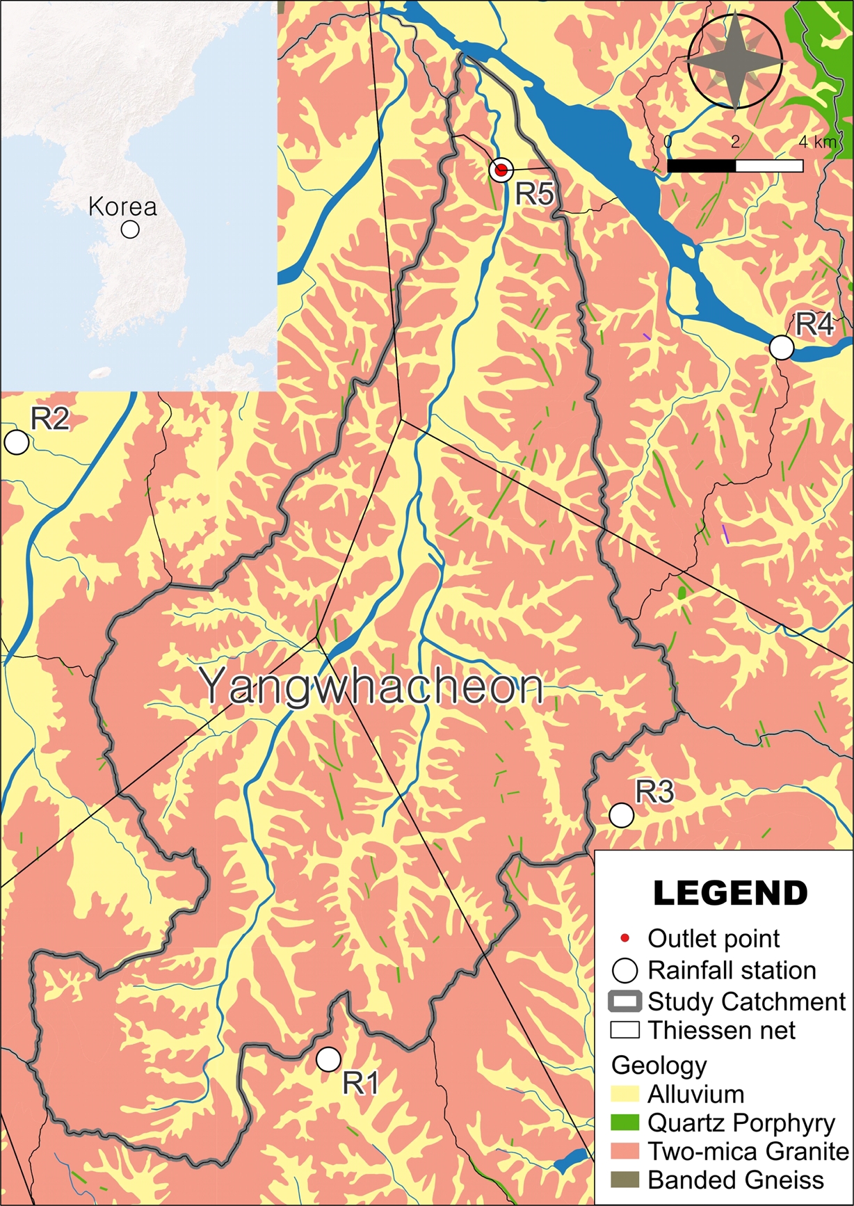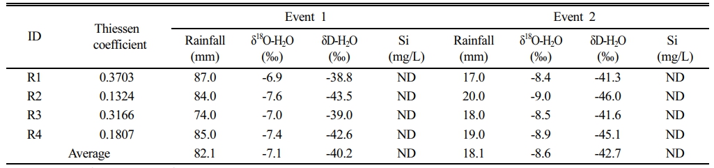 Table 2 Average rainfall, stable isotope composition of rainfall water, and Si concentration in the Yangwhacheon catchment calculated using the Thiessen coefficient |