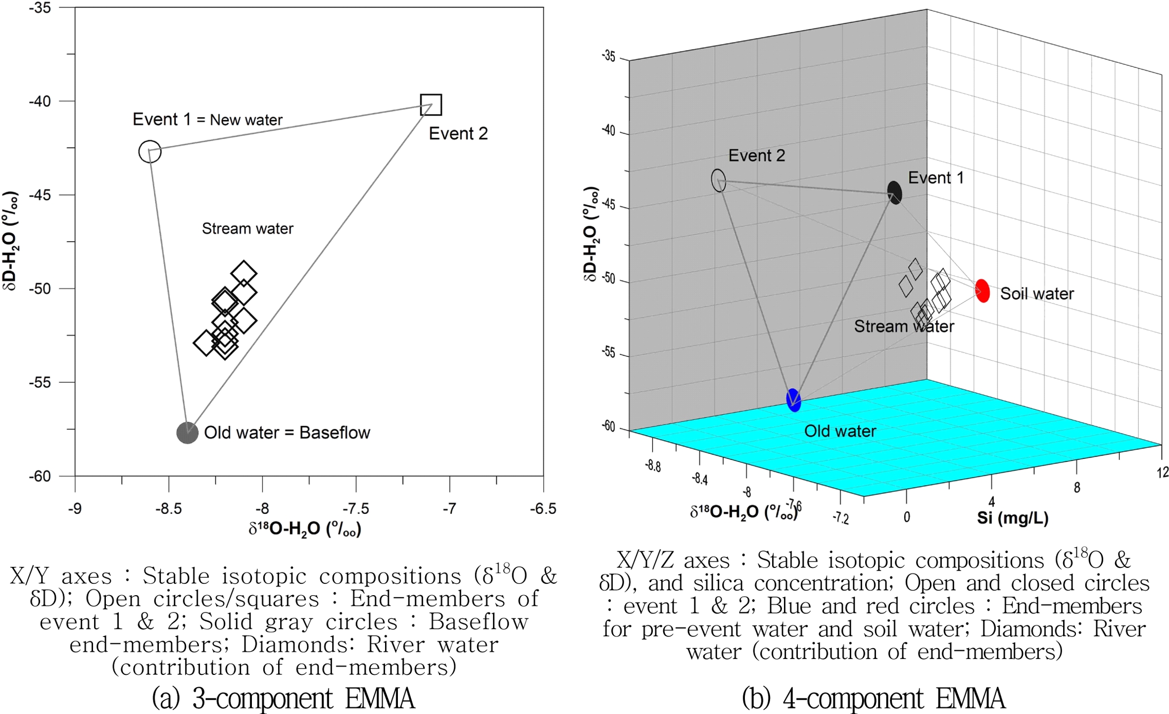 다음 Fig. 2는 Table 2와 3으로부터 결정한 수문곡선을 4개 요소(과거유출, 토양수, 강우 1과 2)로 구분하고자 결정한 극단값과 강우 중 하천에서 관측된 값을 나타낸다. 하천수에서 측정된 수질(δ18O-H2O, δD-H2O, Si) 변화는 결정된 최대와 최소의 극단값 안에서 EMMA(end-member mixing analysis)에 의해 적절한 비율로 기여도가 결정된다. 수문곡선에 기여하는 성분을 강우와 기저유출 성분으로 구분하면, 2성분계 혼합모델이다. 여기에 강우 성분을 강우 1과 2로 구분하면, 3성분계 혼합모델(Fig. 2a)이 된다. 여기서, EMMA 적용에 사용된 추적자는 산소와 수소 안정동위원소이다. 그리고 기저유출 성분을 과거유출과 토양수로 구분하면, 4성분계 혼합모델(Fig. 2b)이 된다. 여기서, EMMA 적용에 사용된 추적자는 산소와 수소 안정동위원소, 규소이다.