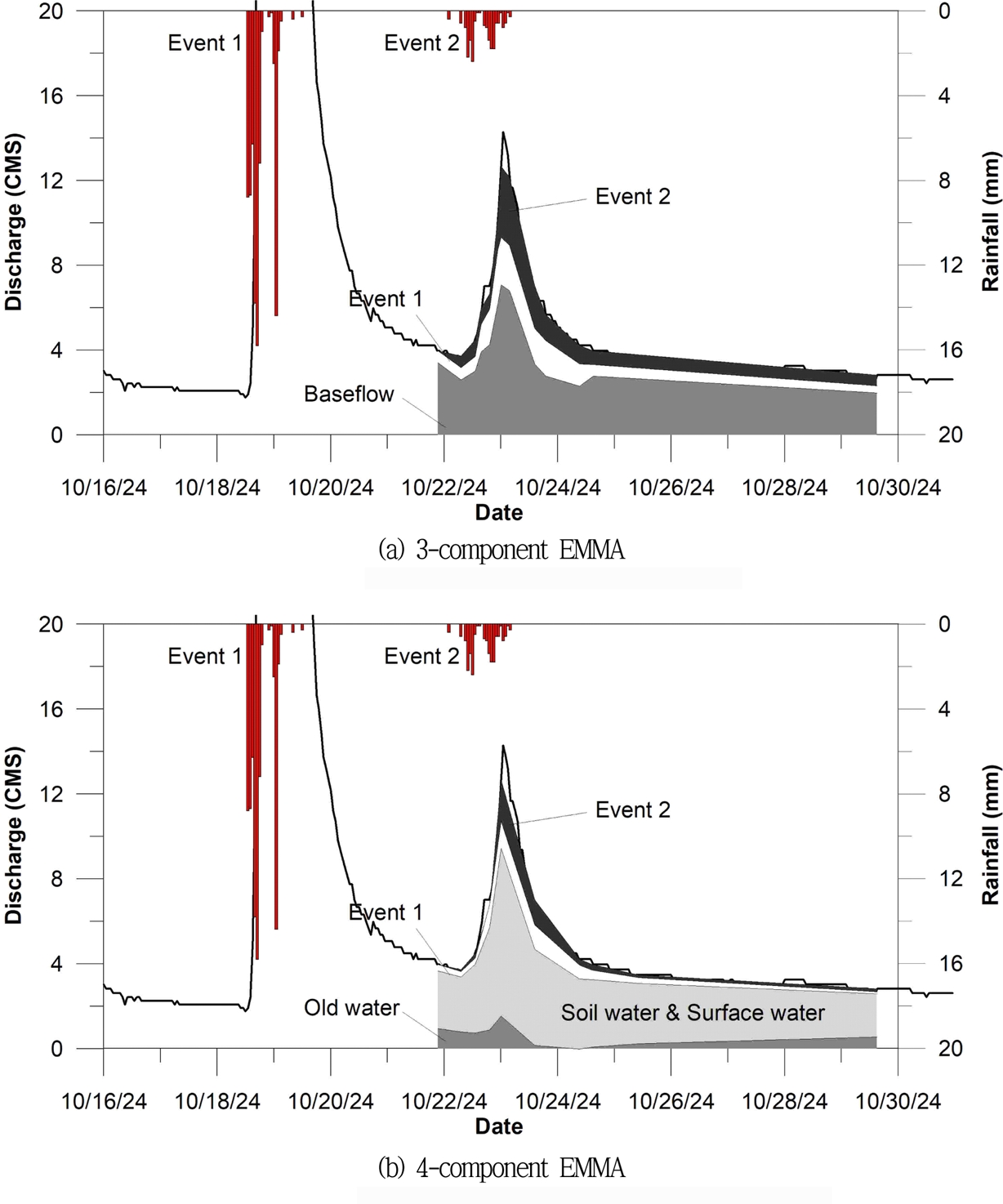 EMMA 의하면, 3과 4성분계 모두에서 강우 1의 성분이 강우 2가 끝났는데도 유출량에 계속 기여하고 있다. 특히, 강우 1의 유출량 기여도가 강우 2의 것보다 훨씬 크다. 강우 1의 강우량은 82.1 mm이고, 강우 2는 18.1 mm로, 첫 번째 강우가 두 번째 강우보다 4.5배 더 많다. 그리고 강우 1과 2의 시간적 간격은 2일 정도로 짧기에 강우 1의 성분이 강우 2의 종료 이후에서도 수문곡선에 계속 기여하는 것으로 생각한다. 3과 4성분계 모두에서, 하천 유출량이 최대일 때 기저유출이 가장 컸다. 시간별로 3성분계는 최대 유출량 이후 1일이 지나고, 10월 24일경에 크게 변했다. 4성분계는 동일한 시각에 기여도의 변동 폭이 작았다. 연구자들은 기저유출을 지하에 저류된 물이 피스톤 흐름(piston flow)으로 인해 하천에 공급되는 매우 느린 흐름으로 설명한다(Barnes, 1939; Sklash and Farvolden, 1976; Ogunkoya and Jenkins, 1993; Hinton et al., 1994; Kendall et al., 1995; Kendal and McDonnell, 2000; Sophocleous, 2002). 이 가설에 의하면 수문곡선에서 분리된 기저유출의 변동 폭은 작아야만 한다. 시간에 따른 Fig. 3a와 Fig. 3b의 기저유출 변화는 3성분계로 표현된 Fig. 3a가 크다. 본 연구에서는 느린 흐름을 갖는 기저유출 성분의 특성을 표현하는데 토양수 성분이 포함된 4성분계가 더 자연스럽다.