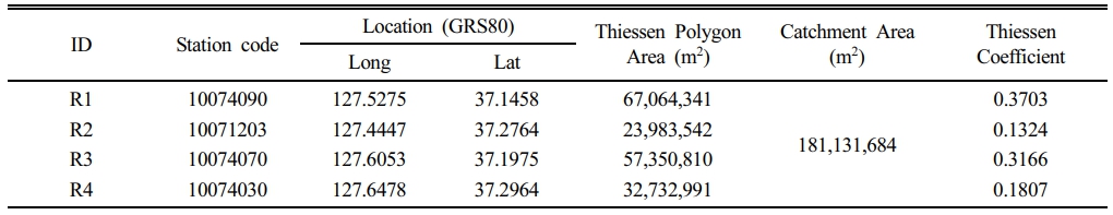 연구 지역이 포함된 여주의 평년(과거 30년간 기후 평균, 1991~2020년) 강수량은 1,173.0 mm이다(KMA, 2025). 유역 주변은 한강 홍수통제소에서 운영하는 무인 강우관측소가 있으며, 위치는 장천초교(R1), 이천남초(R2), 금당초교(R3), 및 영월공원(여주대교, R4) 등 4곳이다(Fig. 1 참조). 발생 강우는 2024년 10월 18일~19일 사이(event 1, 이하 강우 1)와 10월 22일~23일 사이(event 2, 이하 강우 2)로, 2회였다. 본 연구에서 평균강수량은 각 강우관측소를 연결하는 티센망(thiessen net)을 작도하고, 망(net)의 중앙에서 수직이 되는 발을 연결하여 티센다각형(thiessen polygon) 작도해 유역에 대한 면적비로 구하였다(Kwak et al., 2020). 면적비(티센계수, thiessen coefficient)는 각 관측소의 영역을 표현하는 무차원 계수이다(Table 1).