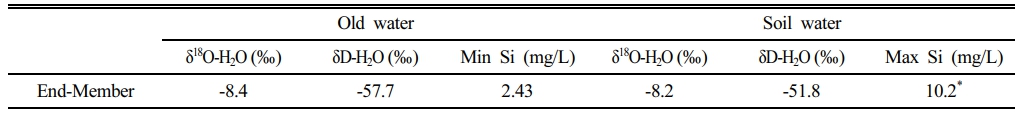 하천수 중 기저유출 성분과 토양수 성분의 극단값을 선정하였다. 기저유출 성분은 강우 1이 발생하기 전, 2024년 10월 17일에 하천으로부터 채수한 시료의 산소 및 수소 안정동위원소 조성으로 선정했다. 만약, 수문곡선에서 과거유출(old water)과 토양수(soil water & surface water) 성분을 하나로 묶어 기저유출(baseflow)로 가정한다면, 수문곡선을 강우와 기저유출 성분으로 구분하는 2성분계 혼합모델(2-component mixing model)이 된다. 그러나 2일 간격으로 후행 강우가 발생했으므로, 결국 수문곡선은 강우 1, 강우 2, 및 기저유출 성분으로 구분되는 3성분계 혼합모델(3-component mixing model)로 볼 수 있다. 기저유출 성분의 산소와 수소 안정동위원소 조성은 각각 -8.4‰과 -57.7‰이다. 기저유출의 규소 농도는 양화천 율곡교에서 1년 동안 정기 분석한 값 중 농도가 가장 낮은 6월과 7월의 값인 2.43 mg/L을 선정하였다. 무강우 시 하천에 공급되는 물은 순순히 기저유출로 가정되었기 때문이다(Table 3).