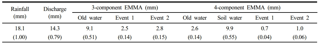 3성분계 EMMA를 수행한 결과, 기저유출, 강우 1과 2는 총 하천유출 14.3mm 중 각각 9.1 mm (18.1 mm의 0.51), 2.5 mm (18.1 mm의 0.14) 및 2.8 mm (18.1 mm의 0.15)이다. 4성분계 EMMA를 수행한 결과, 과거유출(old water), 토양수(soil water), 강우 1과 2가 하천유출 14.3 mm 중 각각 2.6 mm (18.1 mm의 0.14), 9.9 mm (18.1 mm의 0.55), 0.7 mm (18.1 mm의 0.04) 및 1.0 mm (18.1 mm의 0.06) 등이다.