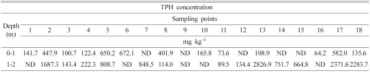 18개 지점에의 지표하 0~1 m(1 심도), 1~2 m(2 심도)에서의 총 TPH 분석을 수행하였다. 총