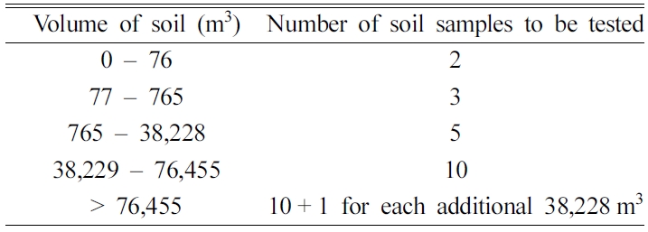 환경부에서는 기존 사례들을 바탕으로 오염토량에 따른 적정 분획 시료수를 제안한 바가 있다(WDE, 2016). 워싱턴 주가 권고한 시료수의 대표성을