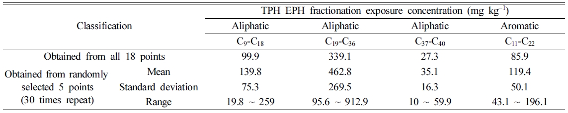 따라서 18개 농도값 중 5개의 농도값을 임의추출하여 각 TPH EPH 분획별 노출농도를 산정하였다. 이러한 과정을 30회 반복 수행하여 얻어진