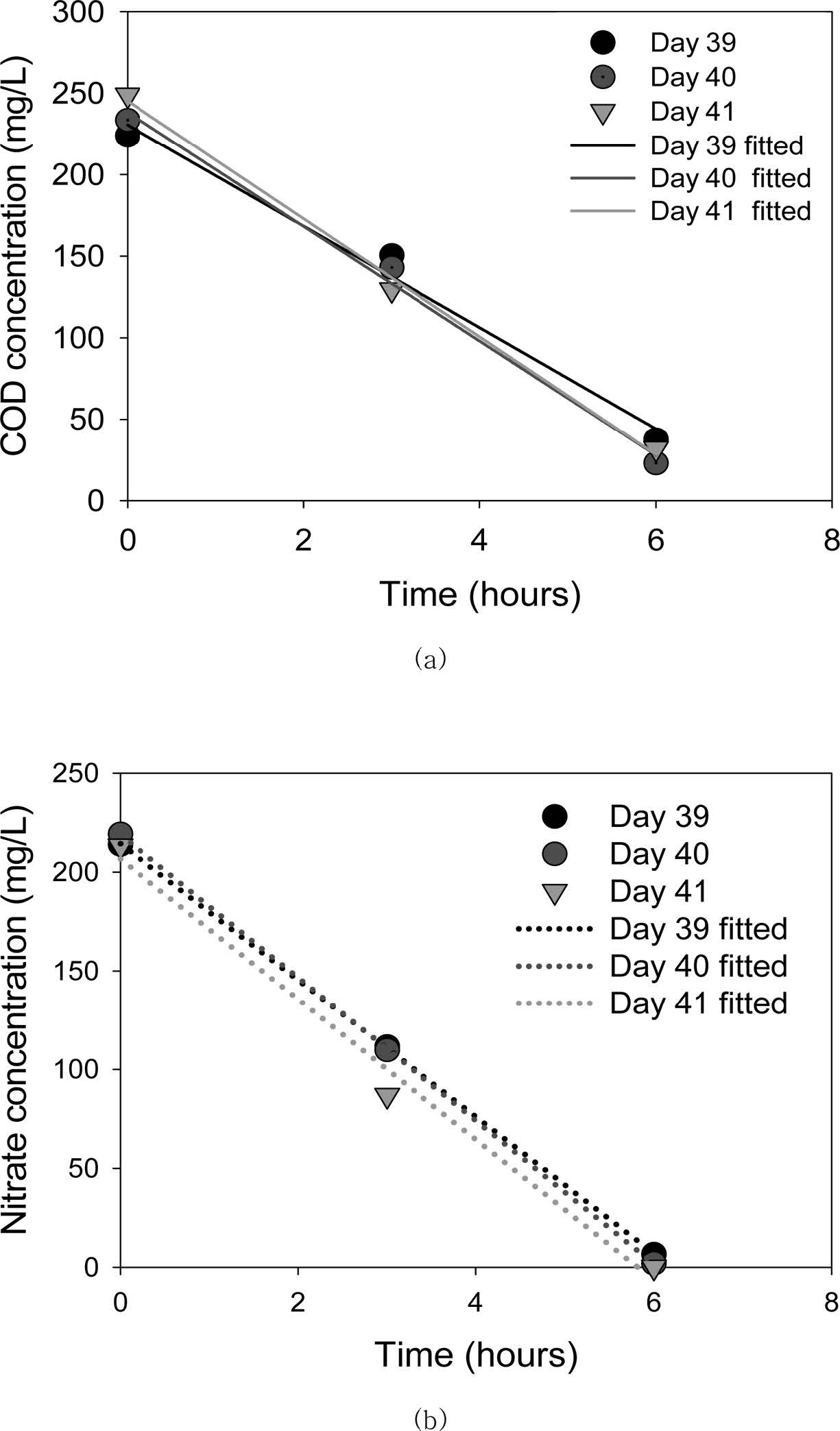Fig. 3 Estimation of zero order removal rate of (a) COD, (b) nitrate during steady state operation in the denitrifying sequencing batch reactor. |