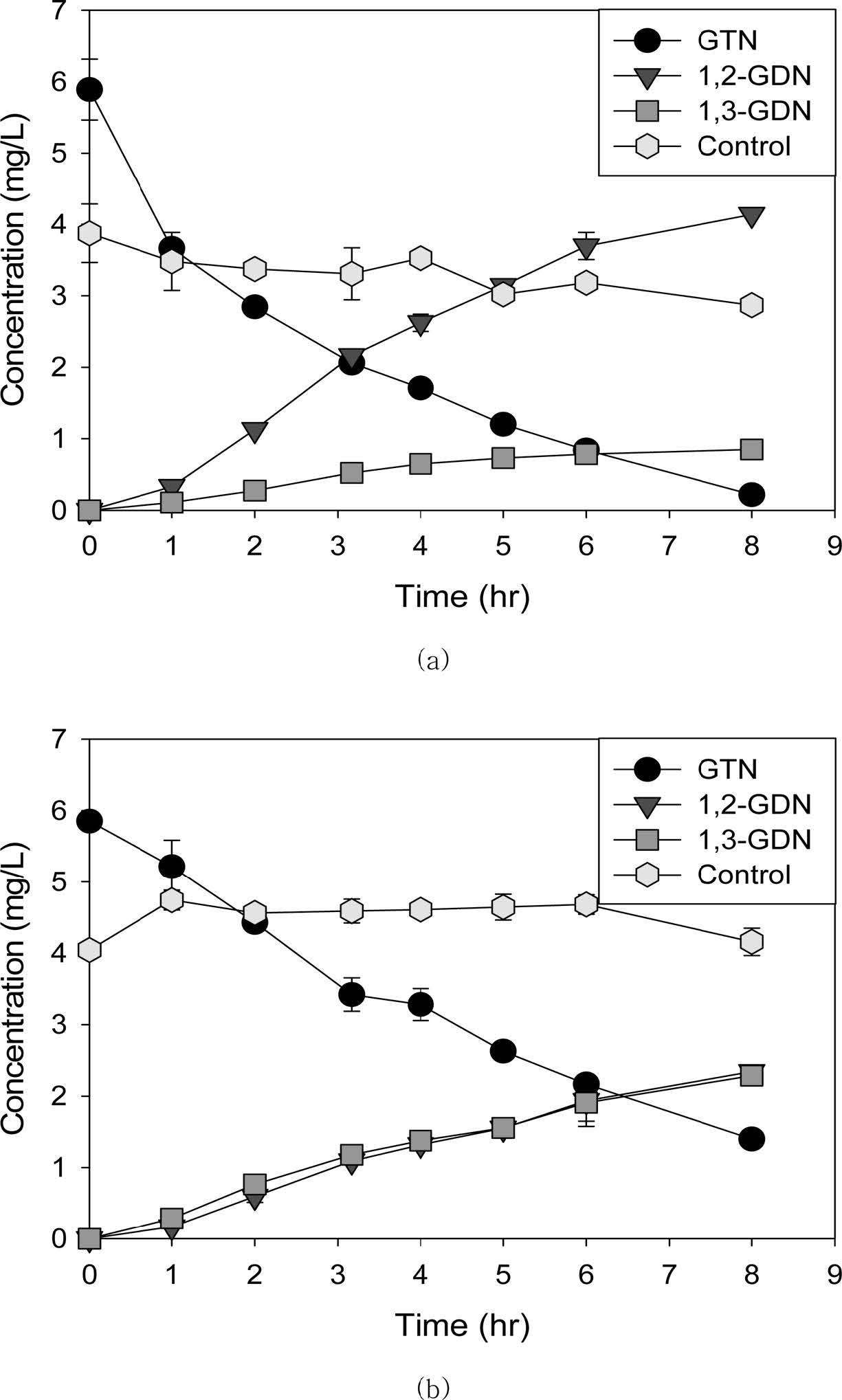 완전 분해할 수 있었는데, 질산기는 대부분 NO2-로 배출되었다. 이 연구에서 초기 농도 0.3 mM의 GTN은 62시간