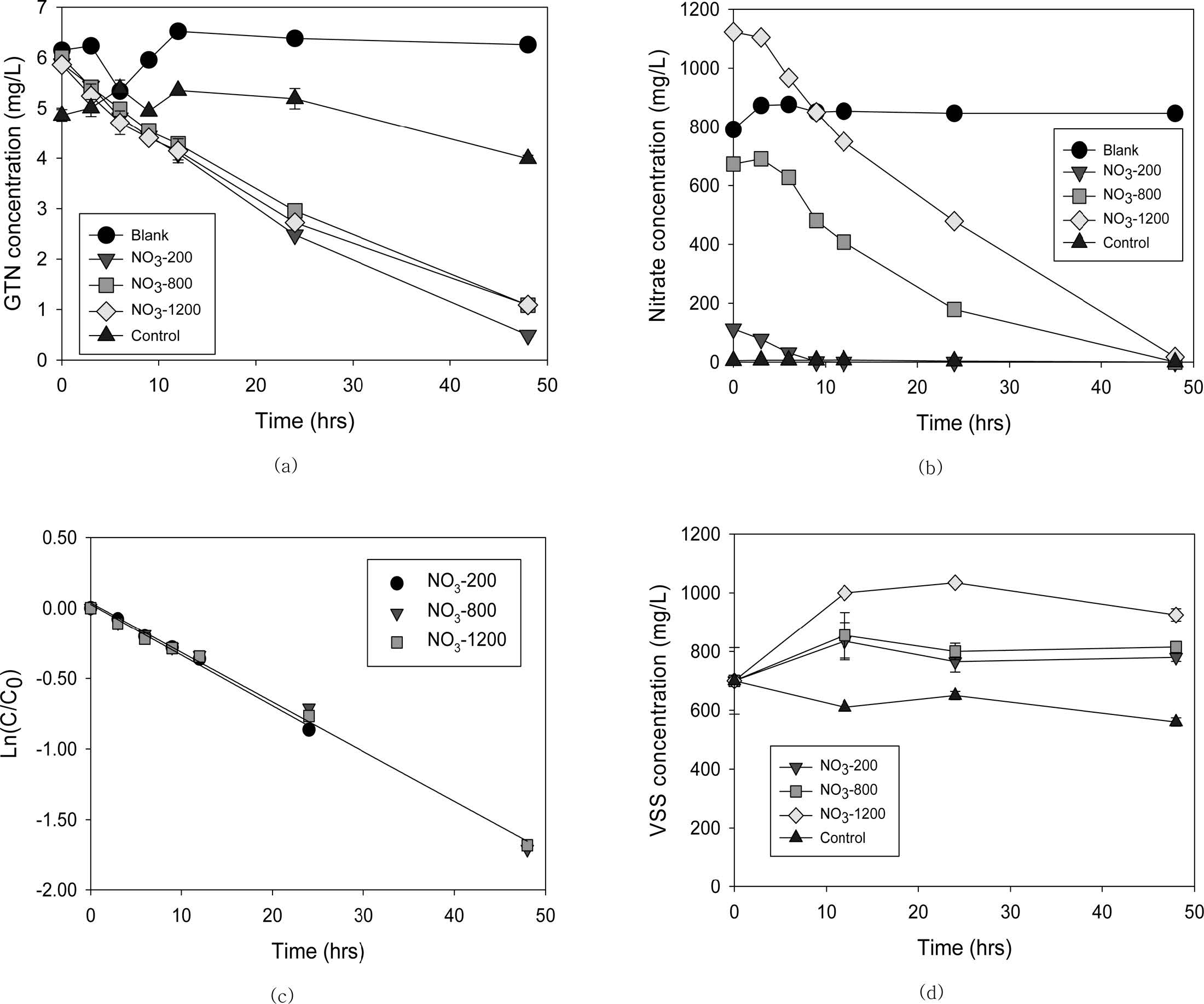 순응미생물에 의한 GTN 분해속도에는 큰 영향이 없으므로, 주어진 조건에서 GTN 분해는 NO3- 농도에 독립적이다(Fig. 5c). 모든 반응조에서 1차제거상수값은 kGTN = 0.034(±0.001)