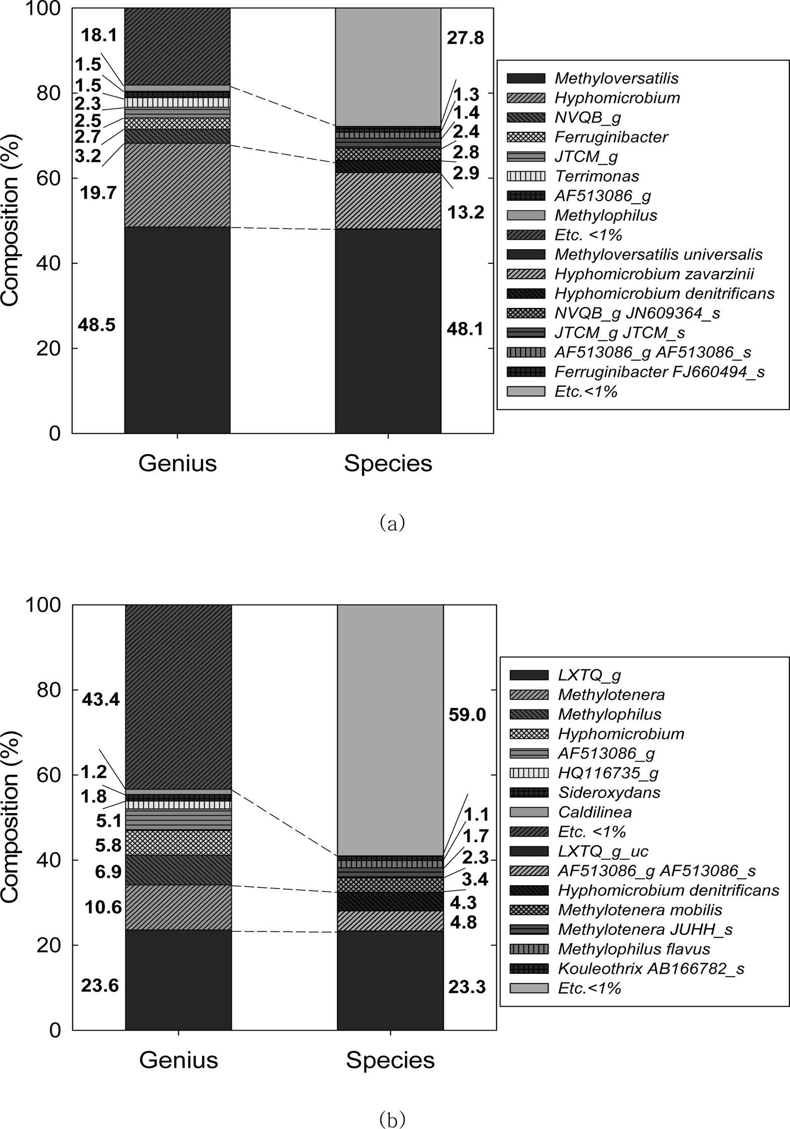 구분하면, 메탄올을 탄소원으로 이용하는 Methylophilus 속이 48.5%로 우점하고 있으며, 다음으로 Hyphomicrobium이