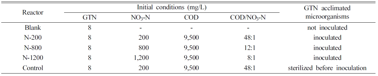 순응미생물에 의한 GTN 분해에 NO3- 농도가 미치는 영향을 확인하기 위해 Table 1과 같이 초기 탄소원(COD)을 9,500 mg/L로 충분히 공급하고