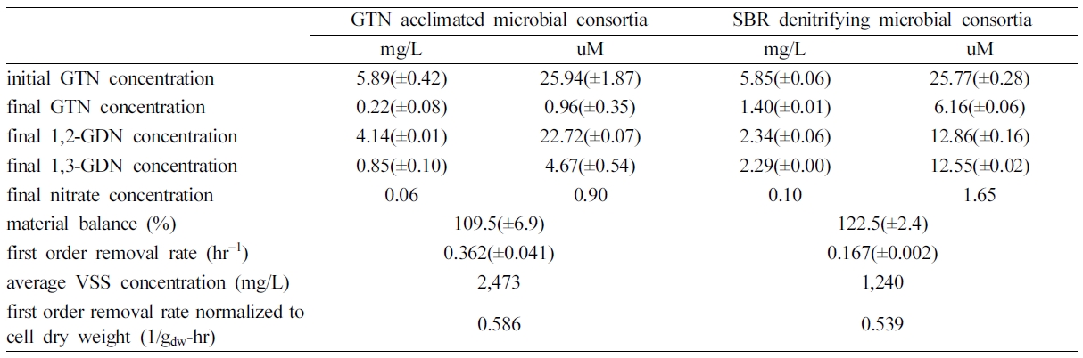 1993). Accashian et al.(2000)은 연속회분식 반응조에서 순응미생물로 100 mg-GTN/L을 처리하였는데,