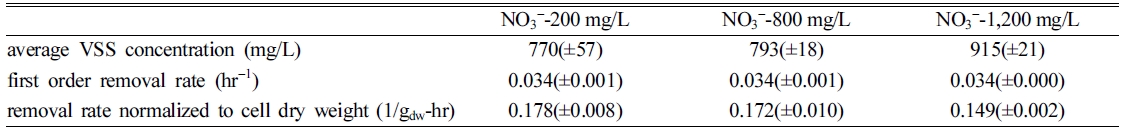 회분식 반응조에서 충분한 탄소원이 공급되었을 때 전자수용체(NO3-) 농도가 증가할수록 GTN 제거상수는 감소하였는데, 미생물 군이 GTN 분해보다 NO3-에 대한 친화력이 높기 때문일 것이라 판단된다. 주어진 NO3- 농도 200 mg/L에서 미생물량에 평균화한