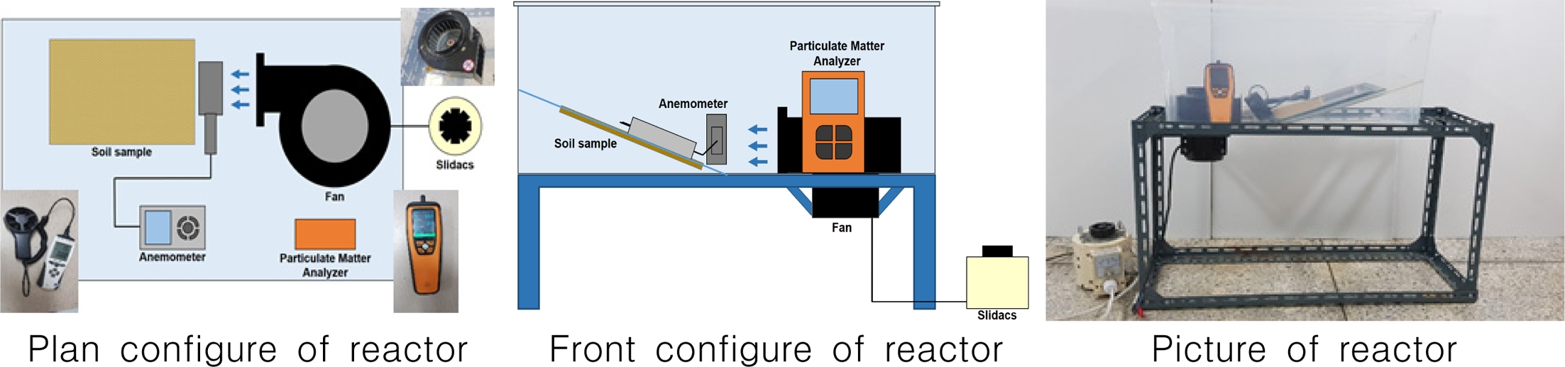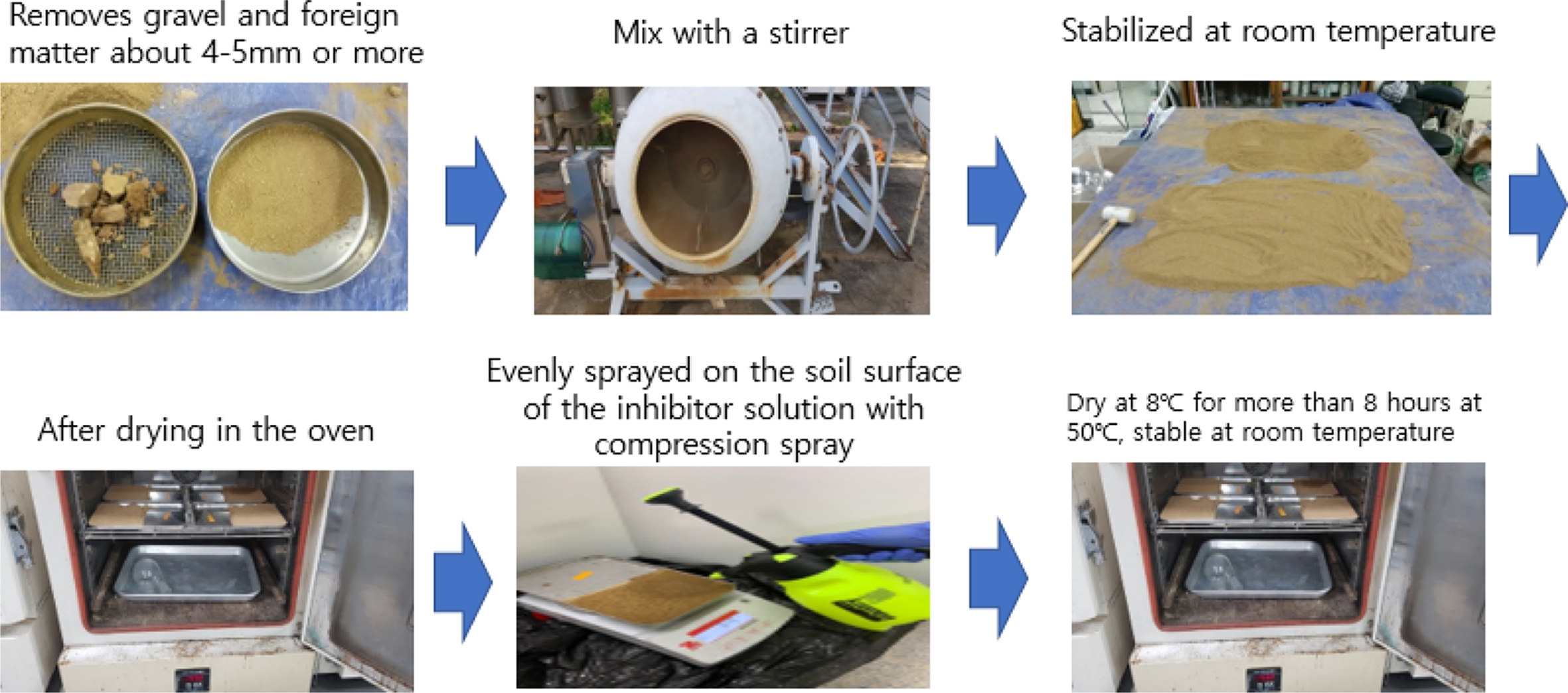 후 압축스프레이로 먼지억제제를 토양표면에 고르게 살포하고 8시간 이상의 건조기간을 가진 후 실험에 사용하였다(Fig. 1).