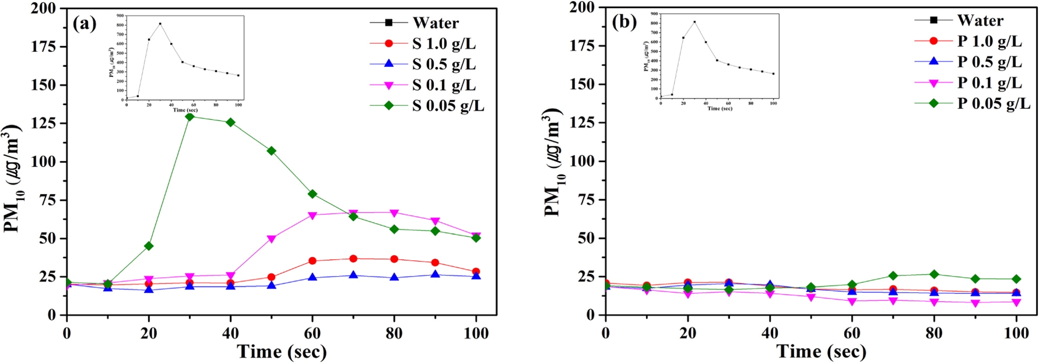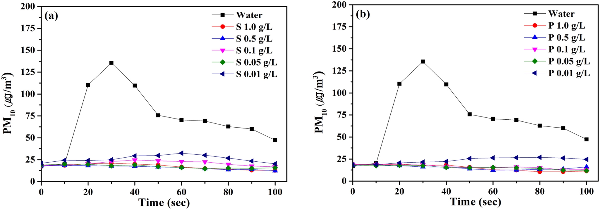 Fig. 4 PM10 emissions of sandy loam soil after treated with dust suppressants ((a) starch, (b) PVA). |