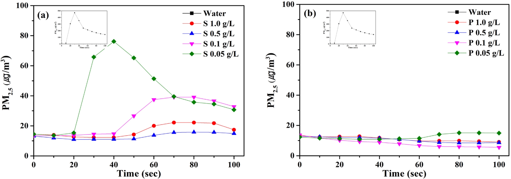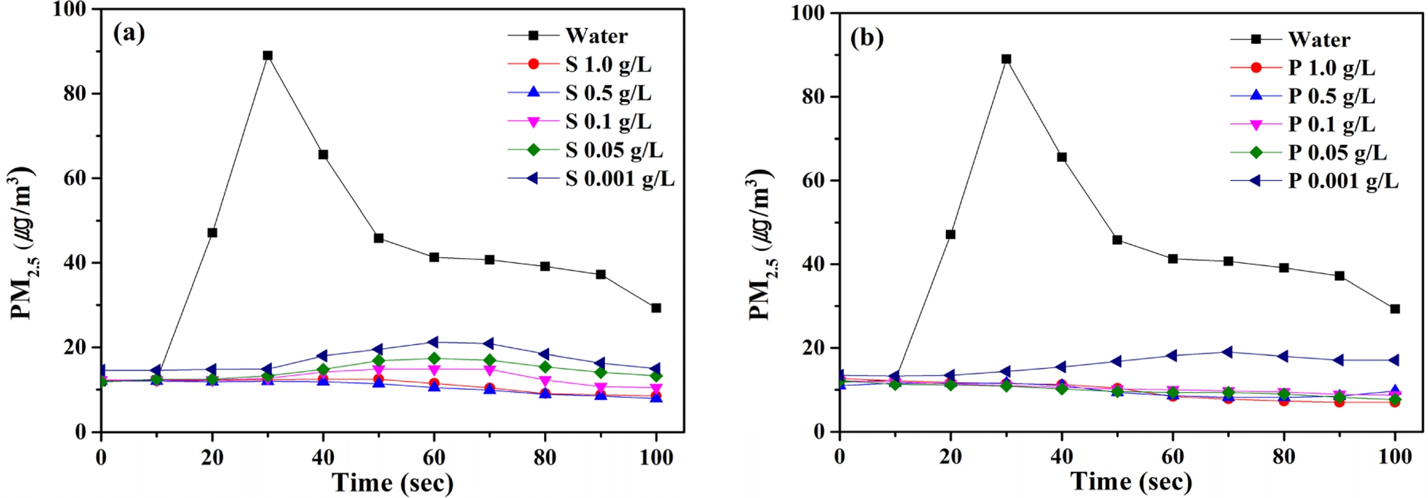 Fig. 6 PM2.5 emissions of sandy loam soil after treated with dust suppressants ((a) starch, (b) PVA). |
