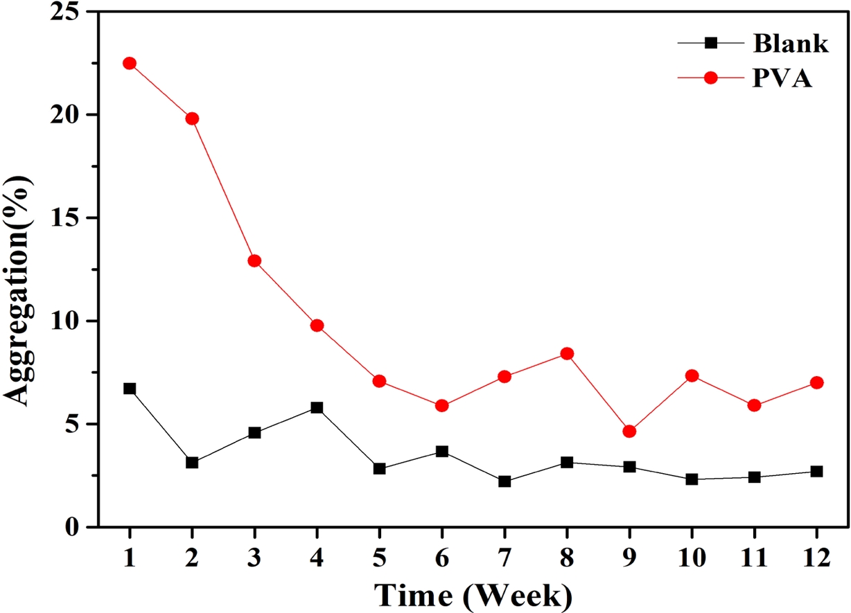 알 수 있다. 이러한 입단화 안정성은 시간에 따라 감소하는 경향을 나타내었는데 PVA 중합체의 분해에 따른 토양입자들과의 필름구조가 해체되어 나타난