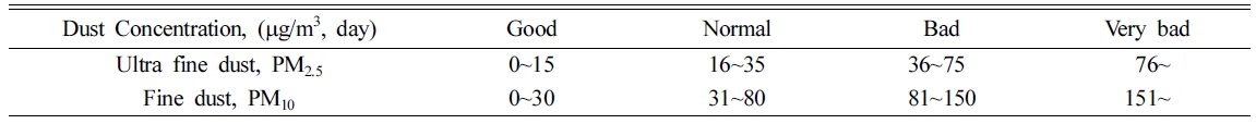 본 연구에서 선정된 적정 농도 조건인 0.05 g/L에서 starch 및 PVA 모두 환경부 미세먼지 “좋음”에 해당하는 PM10과