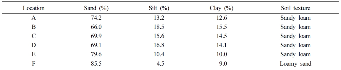 채취한 6곳의 토양의 토성분석 결과 5곳은 사양토로, 1곳은 양질사토로 판별되었다(Table 2). 5곳의 사양토 중 A지점과 양질사토인