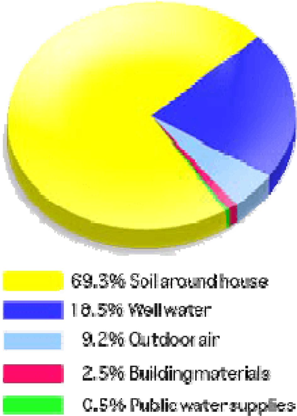 발생할 수 있다. 라돈은 지하수 섭취를 통해 인체로 고농도로 유입될 수는 있지만, 일반적으로는 암반과 흙에서 방출된 라돈의 기체상태의 흡입이 더