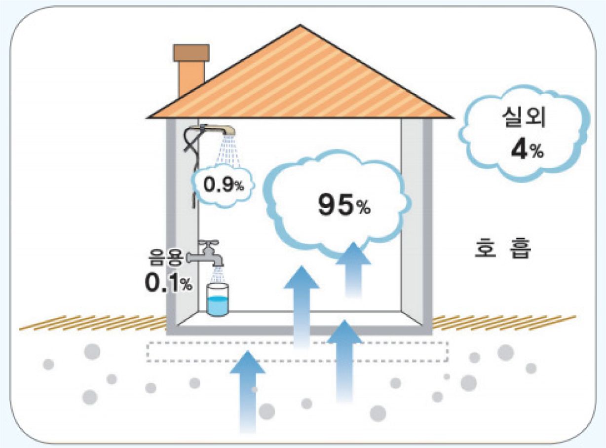 위해도보다 낮은 것으로 알려져 있다. 물에 의한 영향은 전체 약 19%를 차지하며, 이 중 약 89%는 음용, 샤워, 및 설거지 등의 과정에서