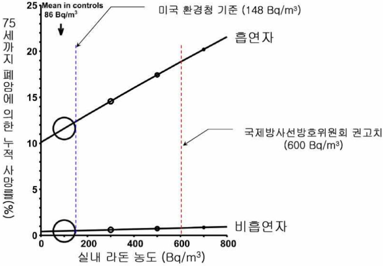 3 개의 그룹으로 분류되었다. 이 연구는 라돈 노출과 폐암 사이의 선형적 반응 관계가 비흡연자보다 흡연자에서 더 명백하다는 것을 보여준다(Kreuzer