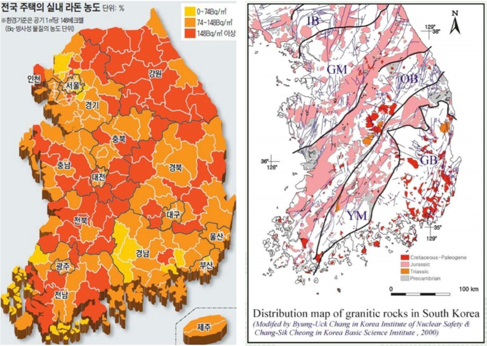 발생한 라돈가스가 높은 농도의 원인일 수 있다. 그러나, 우리나라 환경기준에 따르면 집계된 전국 주택의 실내 라돈 농도는 유해한 수준은 아닌 것으로