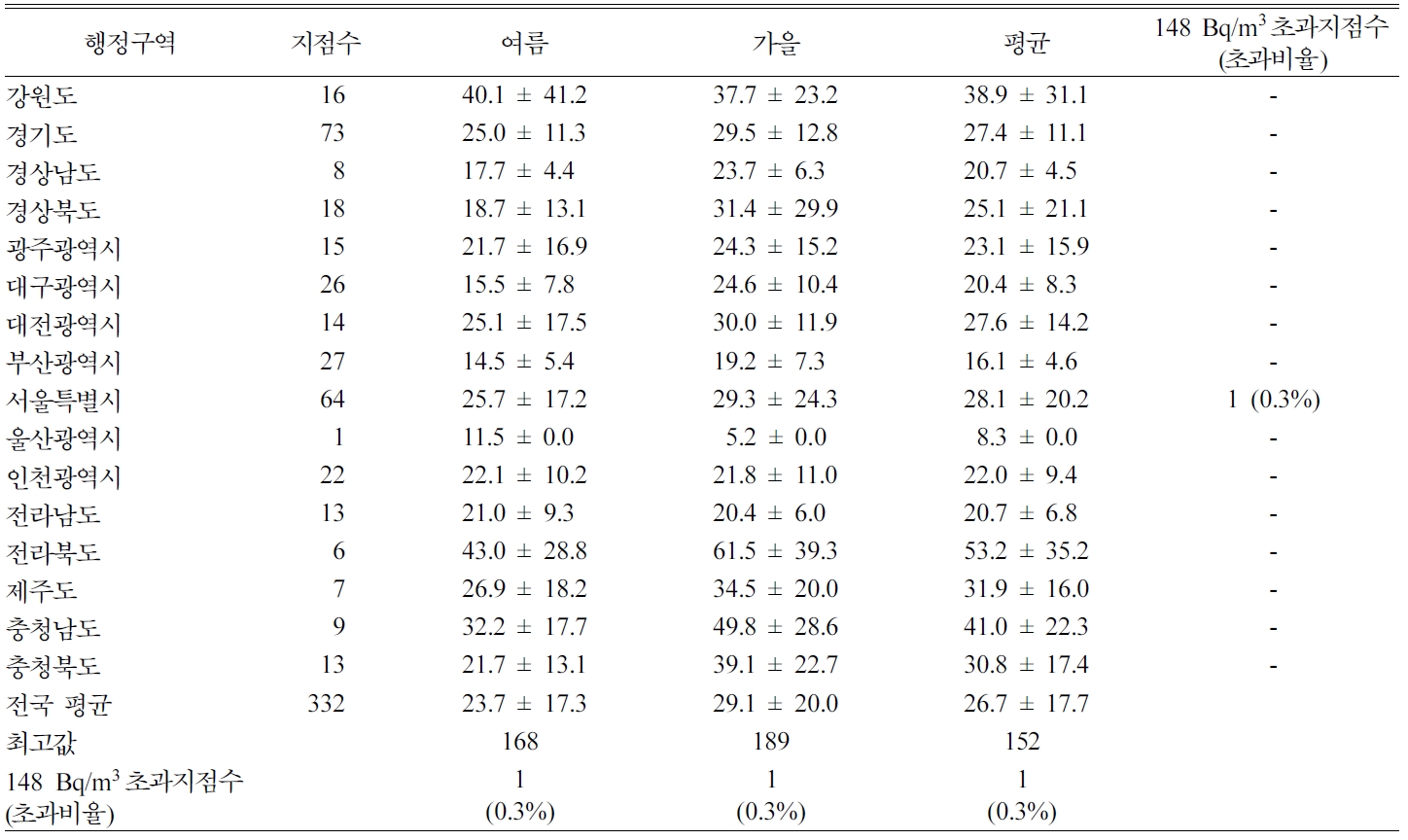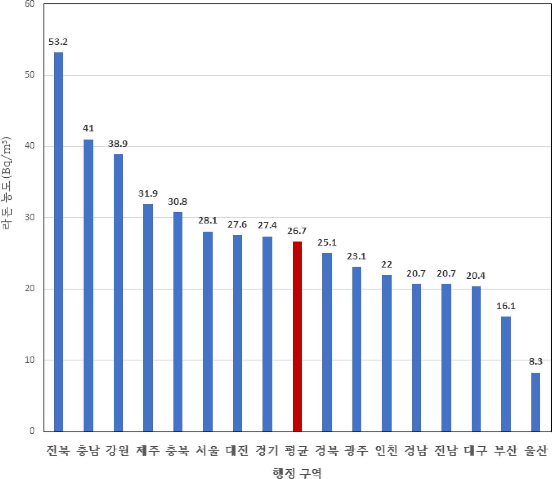 행정구역별 산술 평균 라돈 농도를 집계해 본 결과, 전라북도, 충청남도, 강원도의 평균 라돈 농도가 전체 평균보다 다소 높게 측정되었다(환경부,
