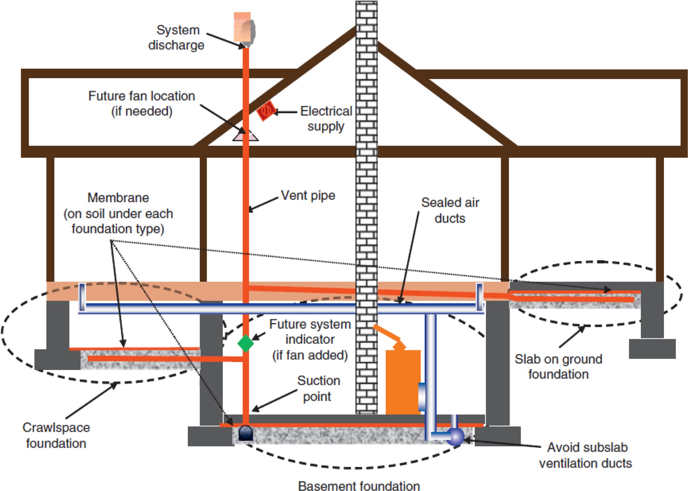 직접 접촉하는 모든 바닥부분에 투과성 막이 설치되어야 한다. 이를 통하여 라돈이 자연배출되도록 유도한다. 대신, 다른 모든 벽체 등에 존재하는