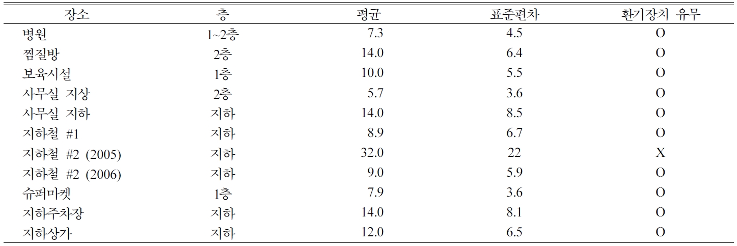 두 번째로 높았으며, 지하상가, 보육시설, 환기장치가 있는 지하철 승강장 순으로 나타났다. 또한, 대형 슈퍼마켓, 병원 1~2층, 2층 사무실