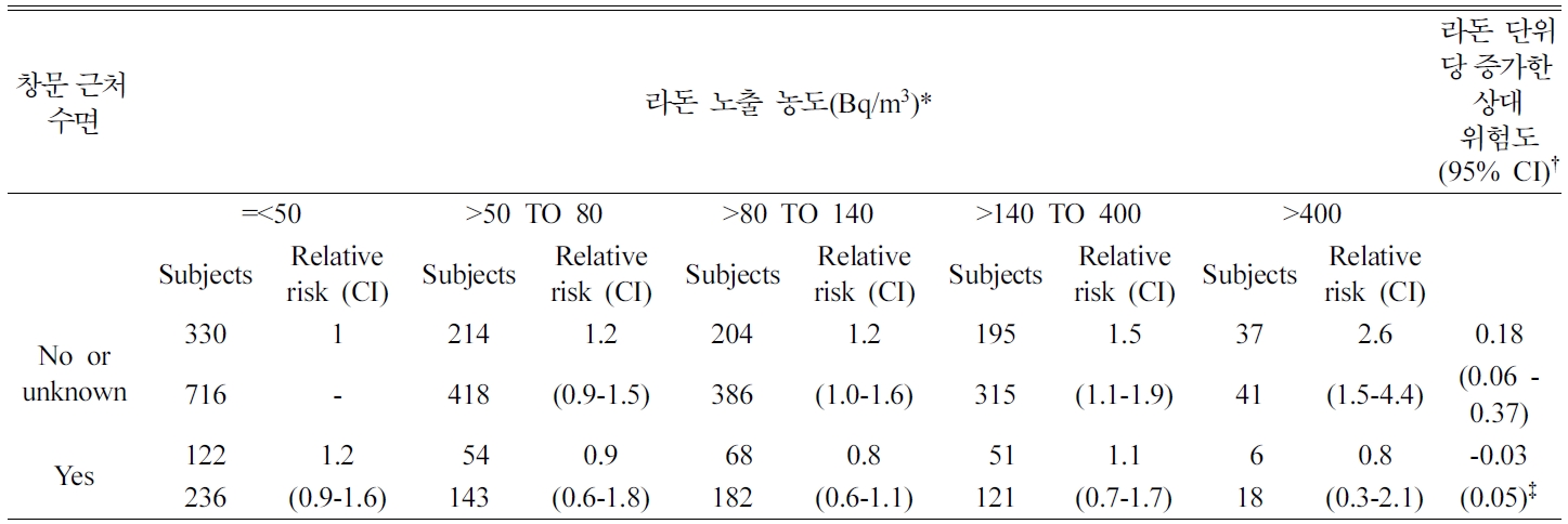 *1 Bq/m3=37*1 pCi/L, 각 분류된 구간의 첫 줄은 실험군의 숫자, 두 번째 줄은 대조군의 숫자를 나타낸다. 상대 위험도와 95% 신뢰 구간(CI) 은 연령, 직업, 성별, 흡연 습관, 주거 지역(도시, 전원) 등을 조정한 후 나타내었다. |